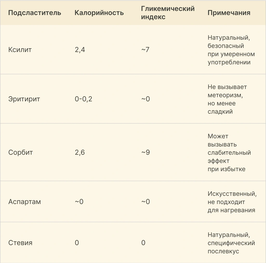Таким образом, ксилит занимает устойчивую позицию между натуральностью, сладостью и умеренной калорийностью, предоставляя оптимальный баланс между вкусом и пользой для здоровья.